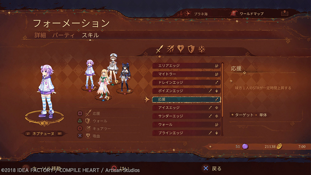 Skills are attacks that characters can use with each Formation. You will be able to use them by either equipping items endowed with Skills or by learning said Skills.